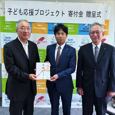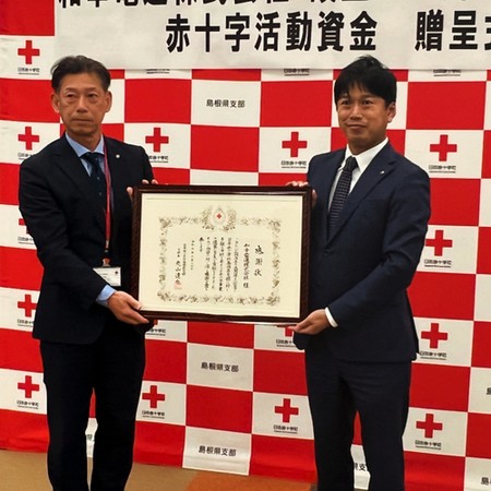 創立55周年記念事業として、災害時の医療救護活動をはじめ、地域や学校などの防災・減災の活動資金を『日本赤十字社 島根県支部』へ また、子ども食堂や子どもの未来を応援する活動資金として『子ども応援プロジェクト』へ寄付をさせていただきました。